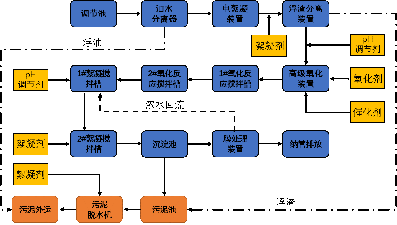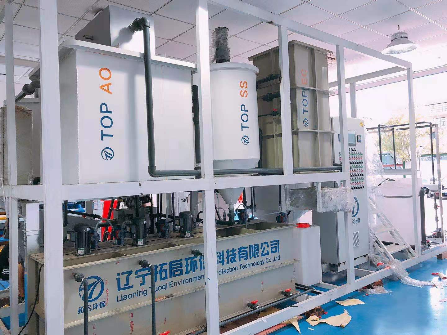 针对乳化液废水水质复杂、波动达、难处理、达标率率低等特点,采用“预处理隔油、电子絮凝破乳、浮渣分离、多维高级催化氧化、多介质过滤、膜过滤”的集成电化学水处理技术,原位“电化学破乳即含油颗粒分离处理”实现污水中污染物的协同治理,“有机物、氨氮、石油类”治理一次到位,彻底解决了高浓度难降解乳化液处理成本高、设备维护繁琐等问题。一体化设备占地面积为21m2,处理规模为12m/d,出水水质达到《辽宁省污水综合排放标准》DB 21/1627-2008表2排放要求。