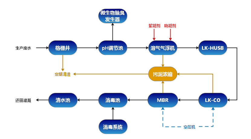 开发“LK-EC+EF气浮油水分离预处理+强化生物选择脱氮除磷工艺+MBR+电加氯消毒”新工艺,处理生产过程中产生的废气冷凝废水、车间地面的清洗废水、洗涤塔废水及锅炉的排污水等。废水的染污物以动植物油、石油类和大量的悬浮物为主,出水可满足《农田灌溉水质标准》GB5084-2005。