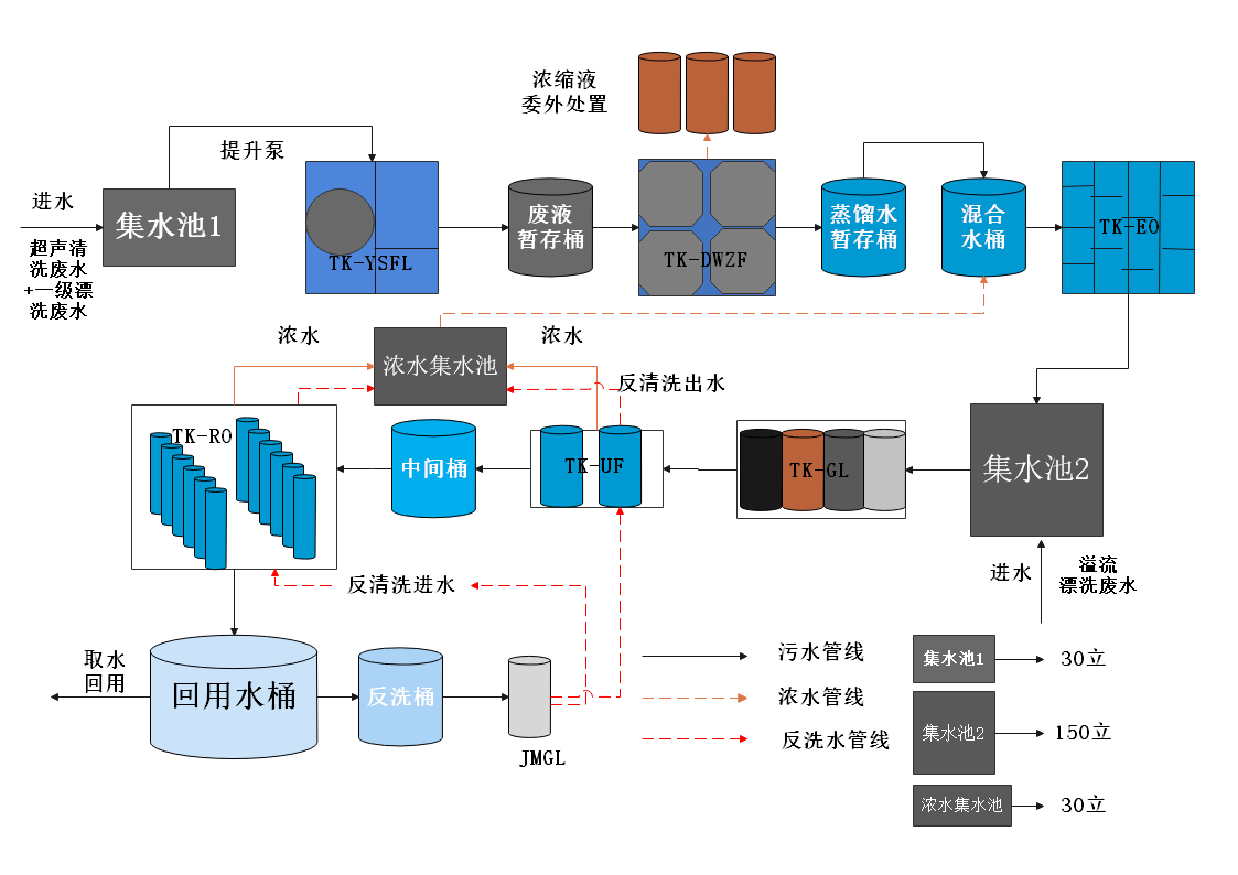 以废乳化液、废清洗剂等为代表的有机液体危险废物是危险废物中的主要类别之一,主要产生于机械加工车、铣、磨、切割、清洗等工序,产生量巨大。开发“LK-EF油水分离+前置过滤+Tk-DWZF+TK-EO电催化氧化+深度回用系统”的组合工艺去除水中有机污染物和盐分,控制出水电导率,废水经处理后排放水质要求满足《城市污水再利用 工业用水水质》(GB/T 19923-2005)中表1—再生水用作工业用水水源的水质标准用于工艺用水循环利用,实现生产废水“近零排放”。